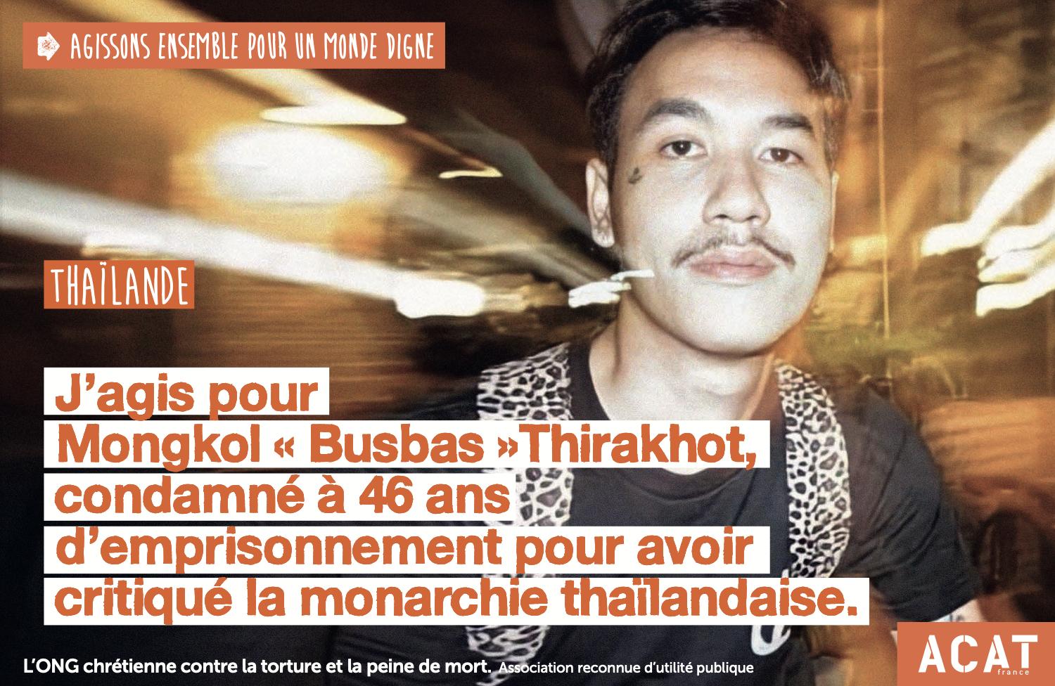 Mongkol « Busbas » Thirakhot, 32 ans, est un activiste thaïlandais pro-démocratie originaire de Chiang Rai, dans le nord de la Thaïlande. Depuis 2020, il participe à des manifestations pacifiques et critique ouvertement la monarchie thaïlandaise ainsi que les atteintes à la liberté d’expression. En 2021, il partage sur Facebook des extraits de l’émission américaine Last Week Tonight se moquant de la famille royale. Il entame la même année une grève de la faim devant la cour d’assises de Bangkok pour demander la libération des prisonniers politiques condamnés pour crime de lèse-majesté, infraction qui punit quiconque insulte, diffame ou menace le roi, la reine, l’héritier ou le régent.