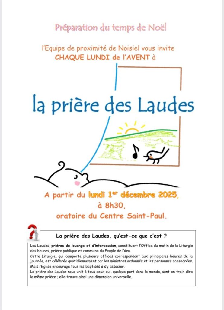 Chaque lundi du temps de l'avent l'équipe de proximité de Noisiel vous invite à la prière des Laudes à 8h30, oratoire du Centre Saint-Paul.