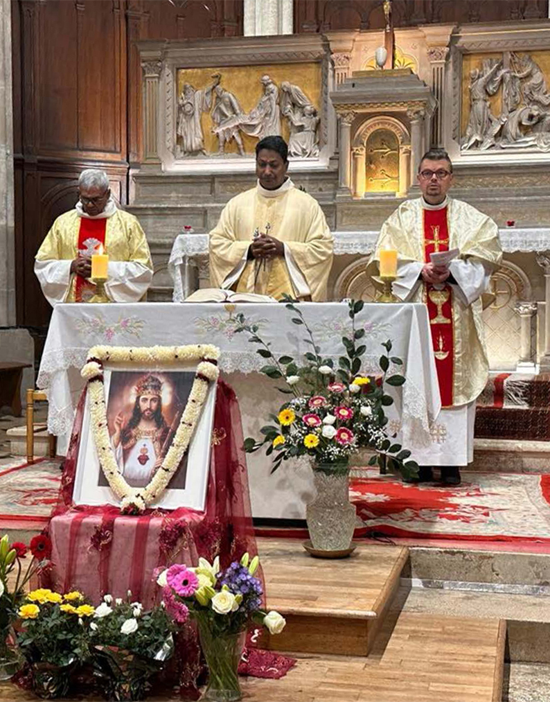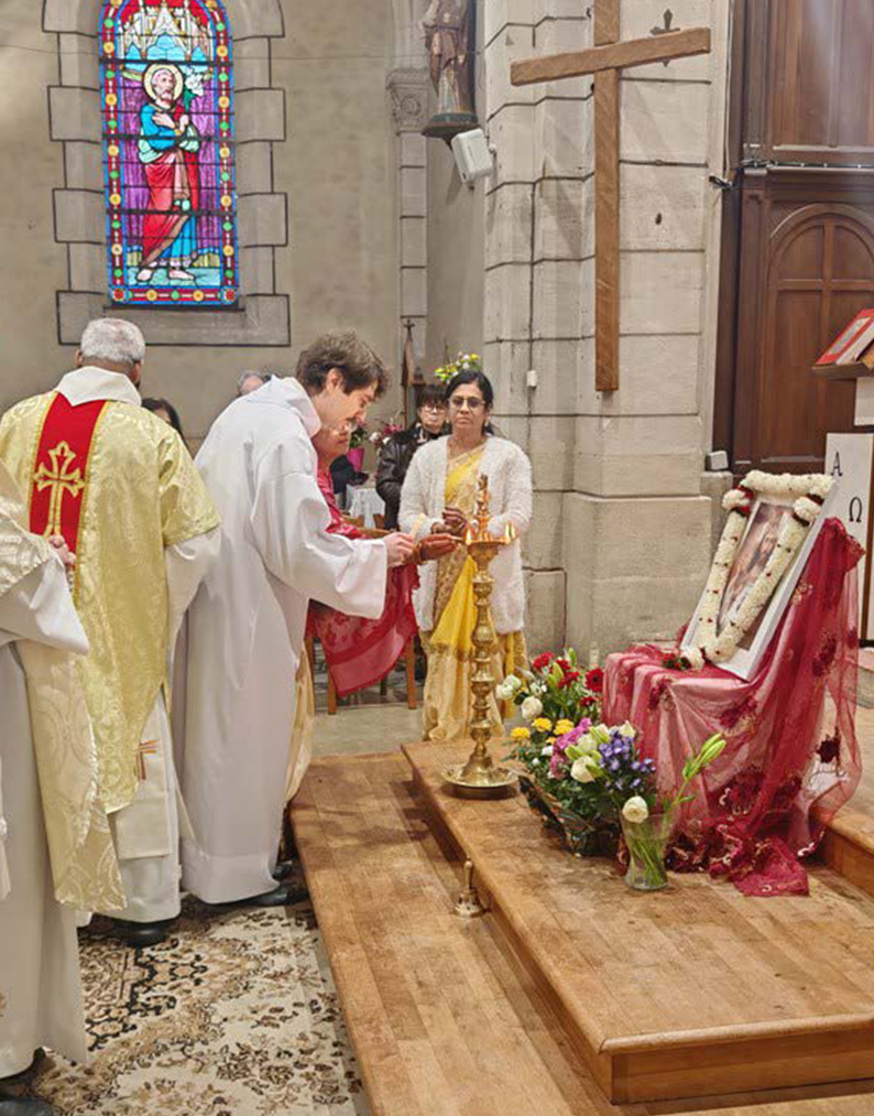 L’église, décorée de motifs traditionnels indiens, offrait un cadre festif et chaleureux. Les chants et lec-tures en langue tamoule ont donné une tonalité particulière à la célébration, soulignant la vitalité de la communauté tamoule et son enracinement au sein de l’Église locale.